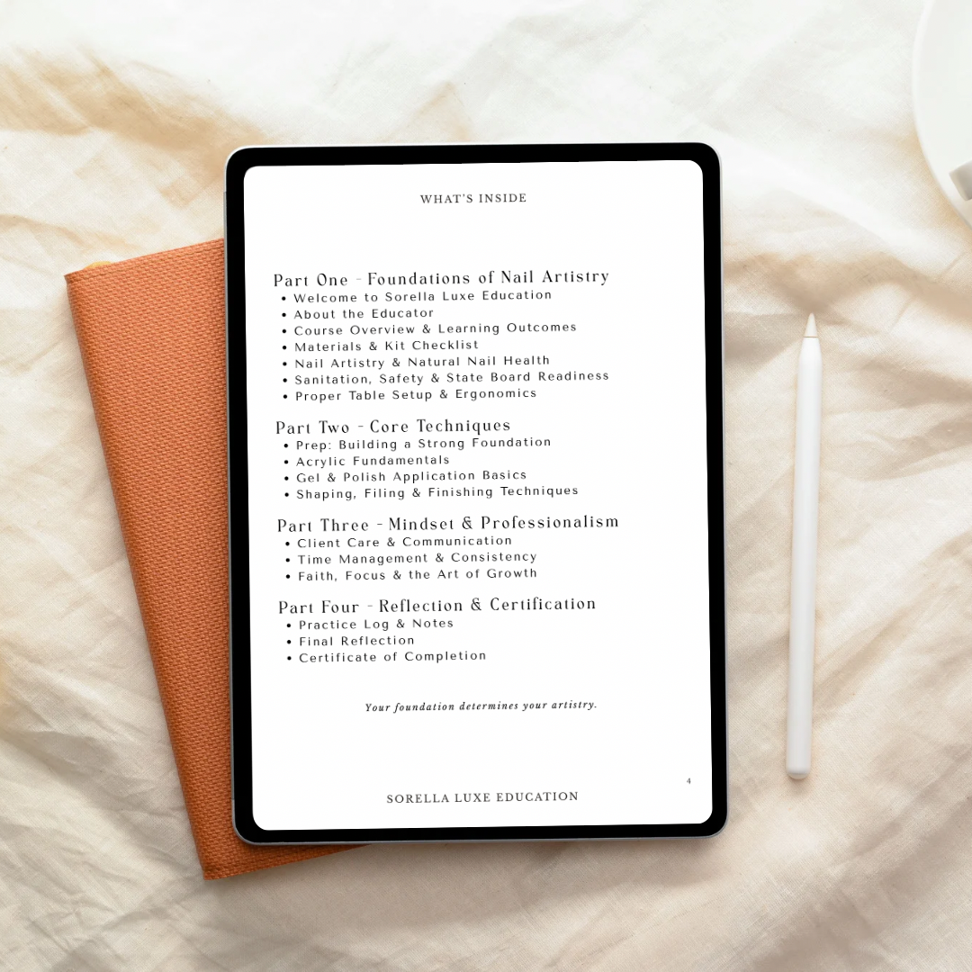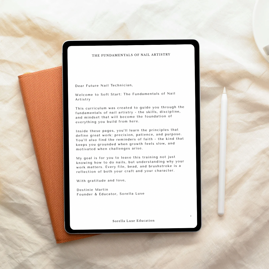 Learn the soft, luxury-first approach I use behind the chair - from prep and application to shaping, designs, and client experience. Designed for beginner and aspiring nail techs ready to master their foundation with intention and confidence.